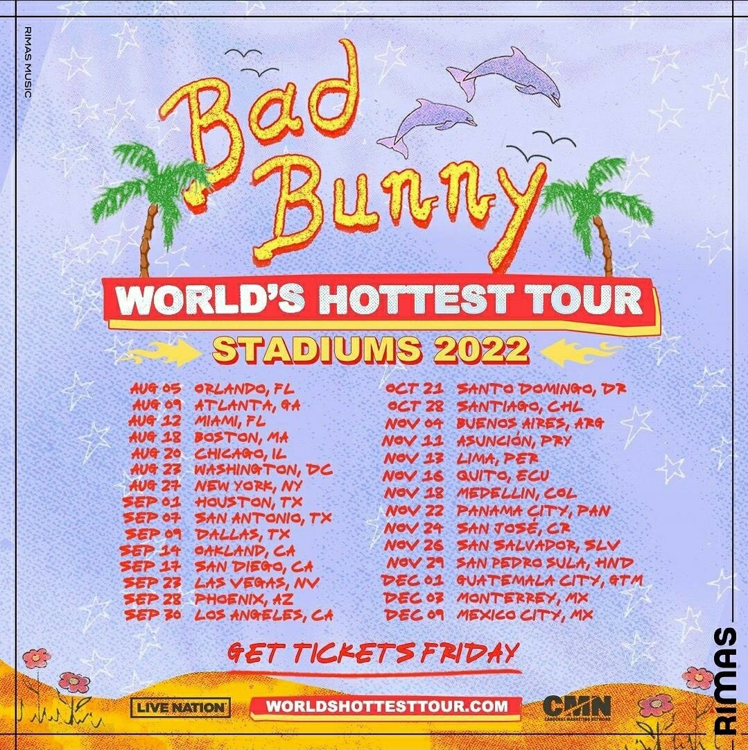 l World’s Hottest Tour comenzará el 5 de agosto en Florida, Estados Unidos. Posteriormente, Bad Bunny se presentará en 15 ciudades del país del notre. Entre ellas Atlanta, Miami, Boston, Chicago, Washington, Nueva York, Hosston, San Diego y Las Vegas.