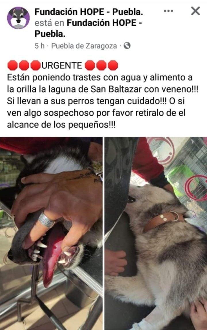 “Están poniendo trastes con agua y alimento a la orilla de la laguna de San Baltazar con veneno. Si llevan a sus perros tengan cuidado, o si ven algo sospechoso. Por favor retirarlo del alcance de los pequeños”, se lee en la denuncia.