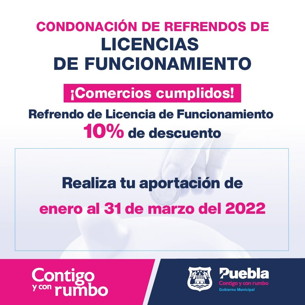 Como parte de la estrategia denominada “Impulsa Puebla” del Ayuntamiento de Puebla, que encabeza Eduardo Rivera Pérez, Presidente Municipal, la Comisión de Desarrollo Económico y Turismo hizo un llamado a comercios a aprovechar los últimos días de condonación en refrendos de licencias de funcionamiento en diferentes giros respecto a los ejercicios fiscales 2020 y 2021.