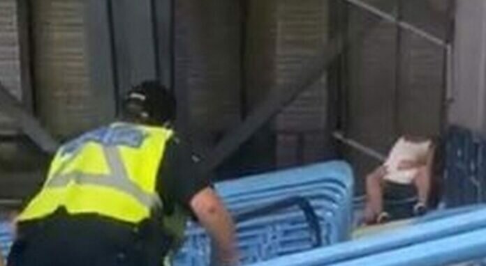 En los vídeos se puede ver a una chica arriba de un hombre, mientras elementos de seguridad se acercan para retirarlos del inmueble.