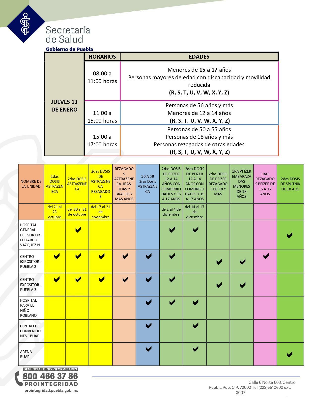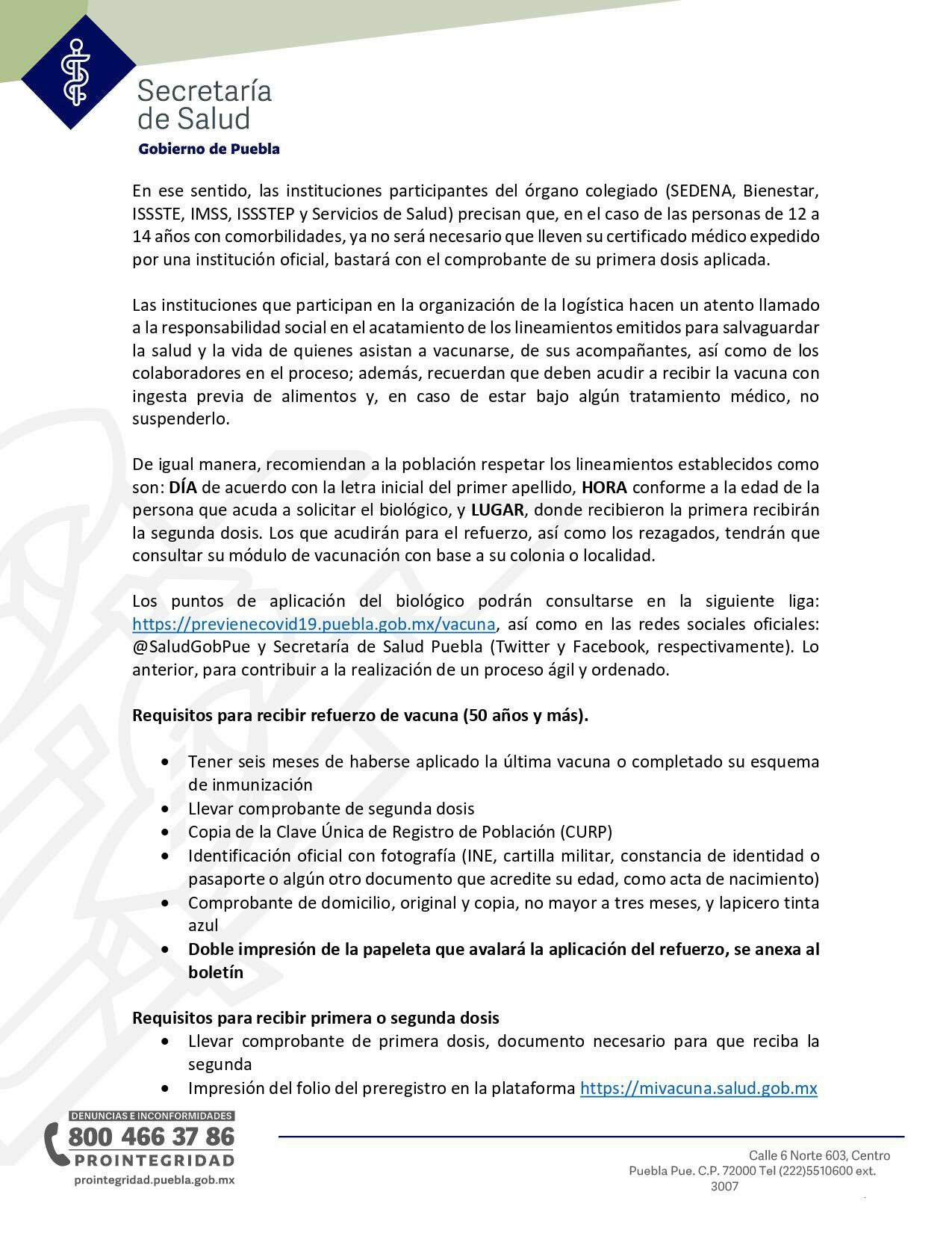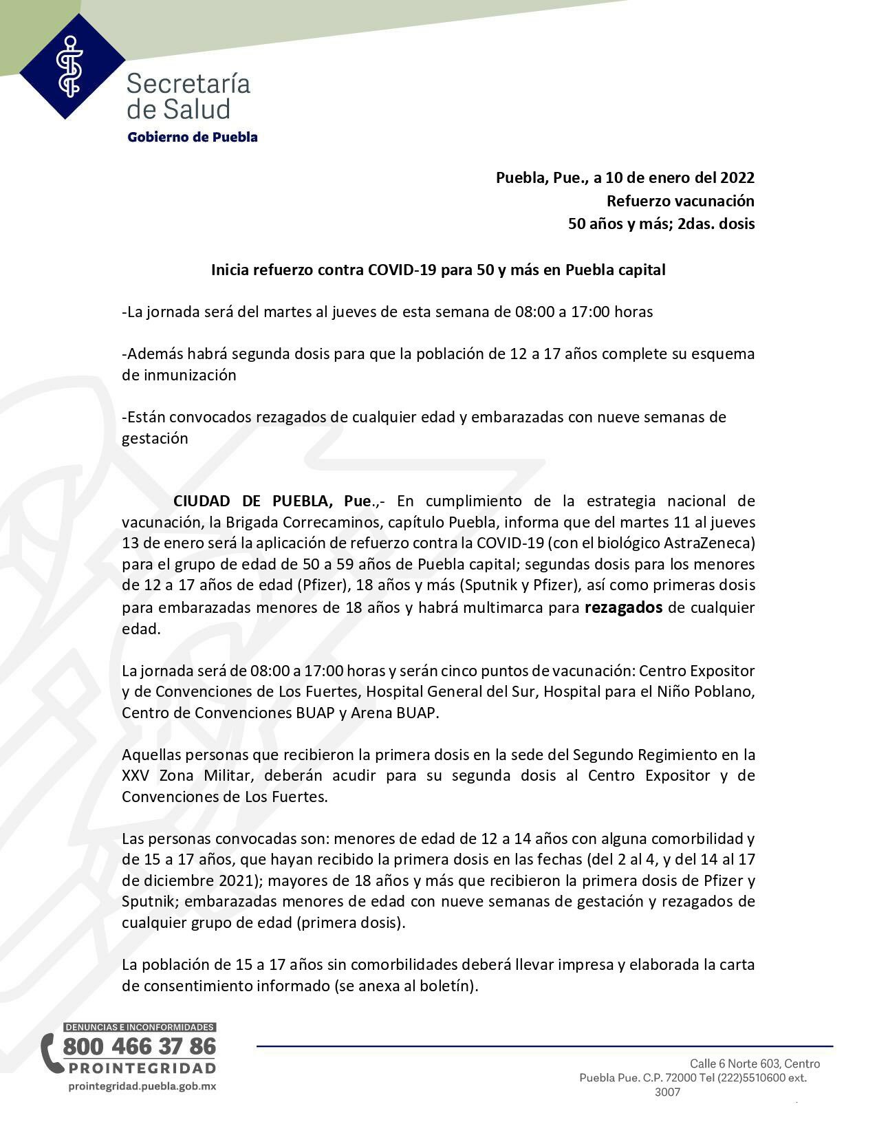 En cumplimiento de la estrategia nacional de vacunación, la Brigada Correcaminos, capítulo Puebla, informa que del martes 11 al jueves 13 de enero será la aplicación de refuerzo contra la COVID-19 (con el biológico AstraZeneca) para el grupo de edad de 50 a 59 años de Puebla capital; segundas dosis para los menores de 12 a 17 años de edad (Pfizer), 18 años y más (Sputnik y Pfizer), así como primeras dosis para embarazadas menores de 18 años y habrá multimarca para rezagados de cualquier edad.