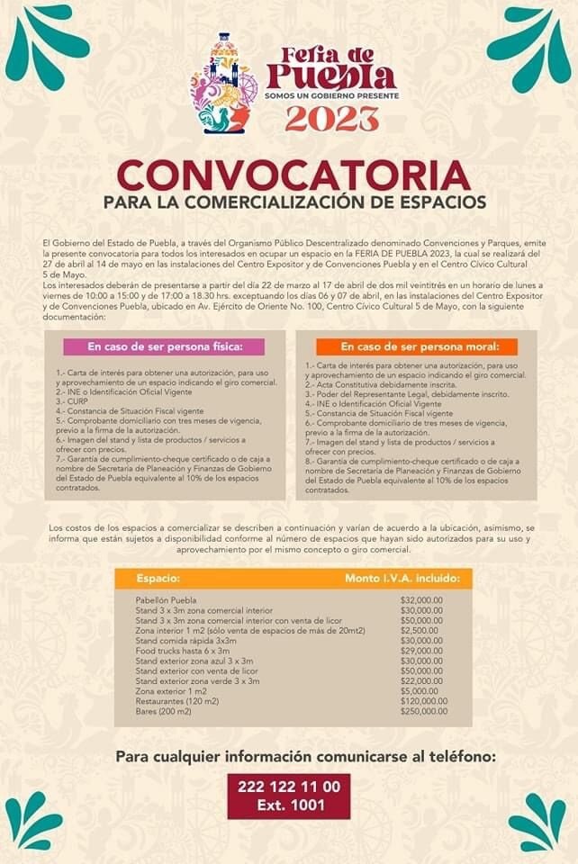 Los interesados en adquirir uno de estos espacios de venta para la Feria de Puebla 2023 deberán de presentarse a partir del día 22 de marzo al 17 de abril, en un horario de lunes a viernes de 10:00 a 15:00 y de 17:00 a 18.30 horas.