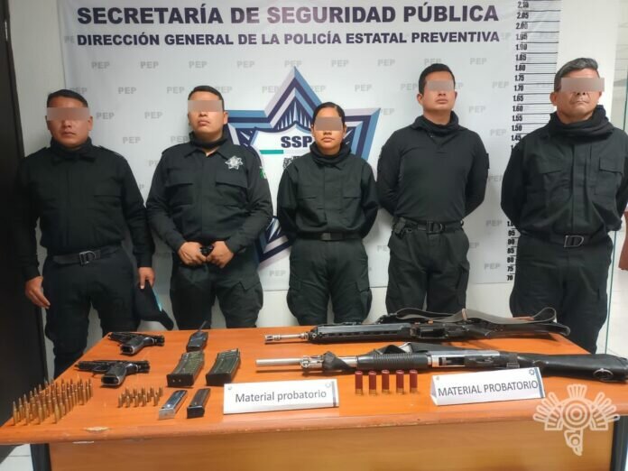SAN PEDRO CHOLULA, Pue. – Por posesión de armas de fuego sin la licencia correspondiente y por usurpación de funciones, agentes de la Policía Estatal detuvieron a cinco personas.