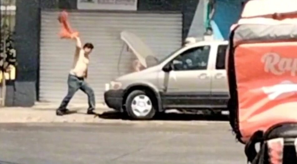 Aparentemente, el vehículo se calentó, por lo que el hombre intentó enfriar el motor con una camiseta, cuando esta, de repente, comienza a incendiarse.