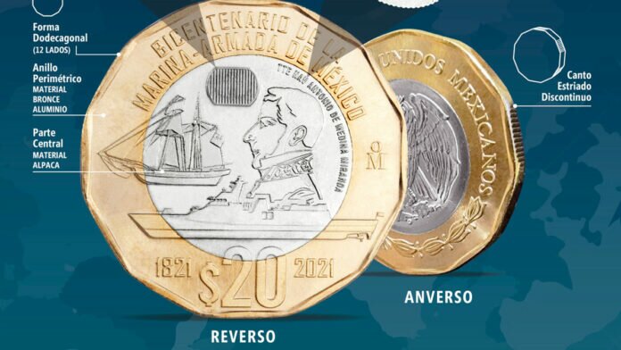 La pieza tiene un valor de 20 pesos y porta el escudo nacional con la leyenda ‘Estados Unidos Mexicanos‘