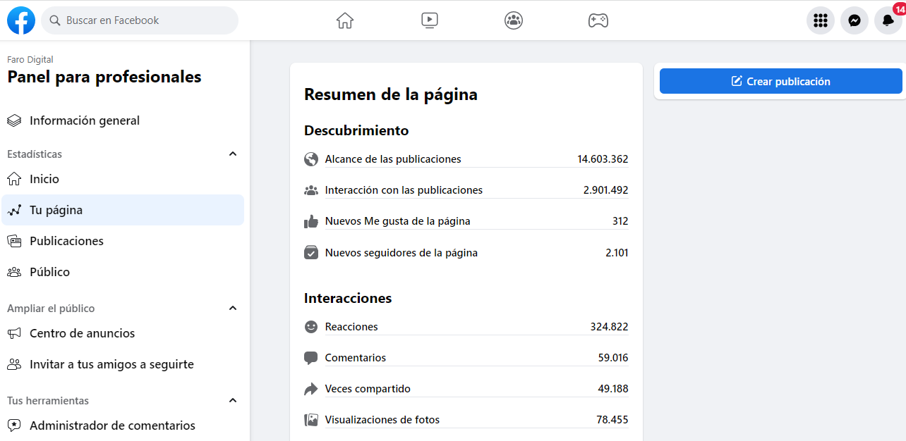 Adicional a lo anterior, Faro Digital tiene 14 millones 603 mil 362 en sus alcances por todas sus publicaciones y 2 millones 901 mil 492 en interacciones.