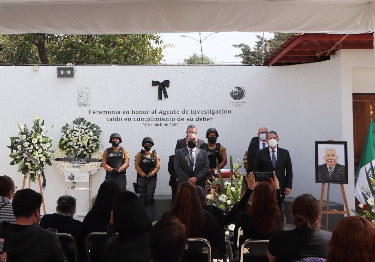 El Fiscal General del Estado, Gilberto Higuera Bernal, encabezó la guardia de honor y pase de lista en memoria del elemento que contaba con más de 30 años de servicio. También entregó a sus seres queridos las banderas de los Estados Unidos Mexicanos, del Estado de Puebla y de la Fiscalía General como símbolo de reconocimiento y agradecimiento.