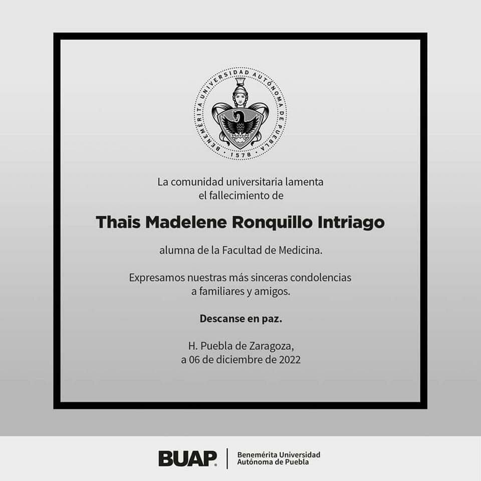 Fue a través de las redes sociales, que la Máxima Casa de Estudios de la BUAP, emitió una esquela para expresar las condolencias por el fallecimiento de la alumna, quien respondió al nombre de Madelene.
