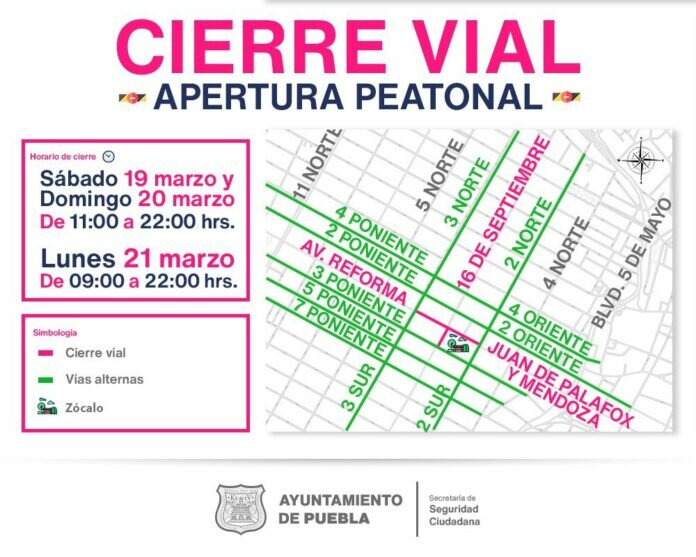 En este sentido, la Secretaría de Seguridad Ciudadana Municipal implementa a partir de las 11:00 horas de este sábado un operativo vial en la calle 16 de Septiembre, entre las Avenidas 3 Poniente y Reforma; así como en Juan de Palafox y Mendoza, de la 3 a la 2 Sur, que se habilitan para el libre tránsito de visitantes, habitantes y empleados de establecimientos.