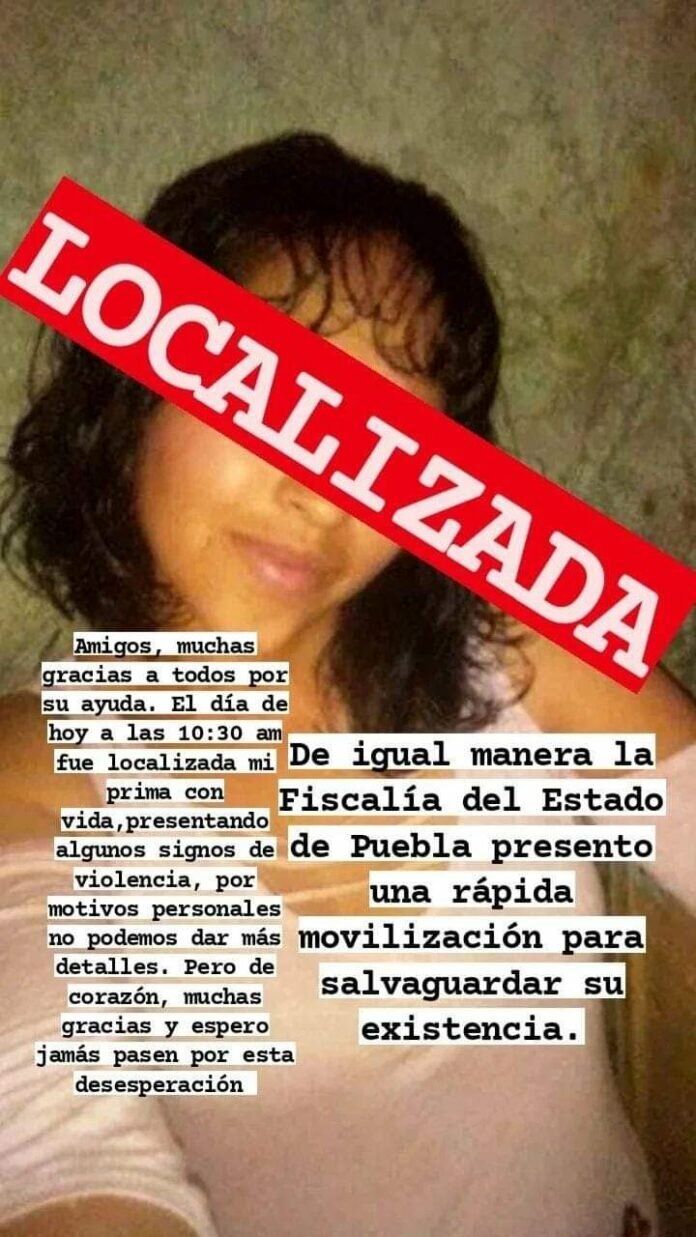 Ayer por la tarde su familia reportó en las plataformas digitales que Mariana fue localizada con vida durante la mañana en inmediaciones del puente de La María, a un costado de la autopista México- Puebla.