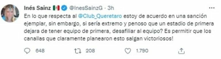 Luego de lo que sucedió en el Estadio Corregidora el sábado pasado, Inés Sainz mostró su postura en redes sociales y dijo que estaba en desacuerdo con la posible desafiliación del Club Querétaro de la Federación Mexicana. La queretana publicó un mensaje en su cuenta de Twitter, en donde dijo que le parecía una pena que esta opción se tuviera contemplada.