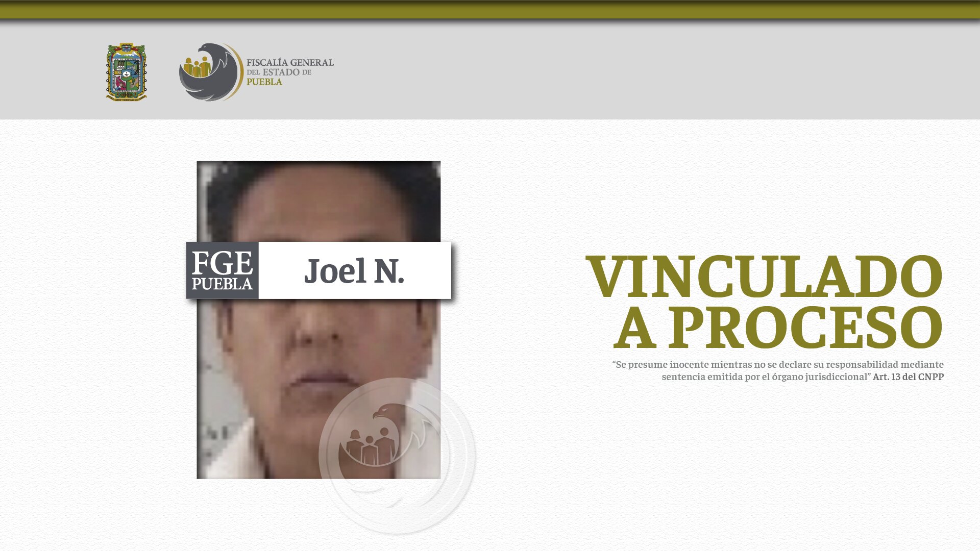 La Fiscalía General del Estado de Puebla a través del Agente del Ministerio Público obtuvo la vinculación a proceso de Joel N., investigado por el delito de homicidio calificado.