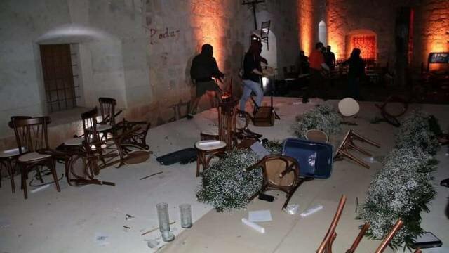 De acuerdo con medios locales y videos, los maestros llegaron a la sede de la boda con mantas, pancartas y bocinas, y poco después, realizaron destrozos del jardín mientras le gritaban “asesina” a Elba Esther Gordillo.