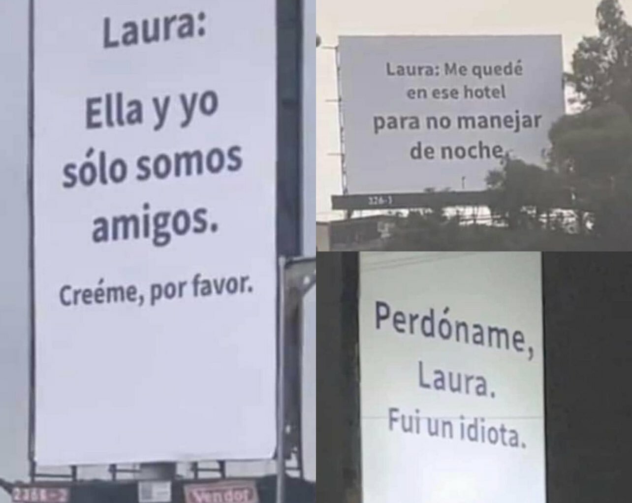 Entre otros de los mensajes que se podían leer en los espectaculares son: “Laura: Me quedé en el hotel para no manejar de noche”, “Laura: ella y yo solo somos amigos, créeme, por favor”, “Perdóname, Laura, fui un idiota”.