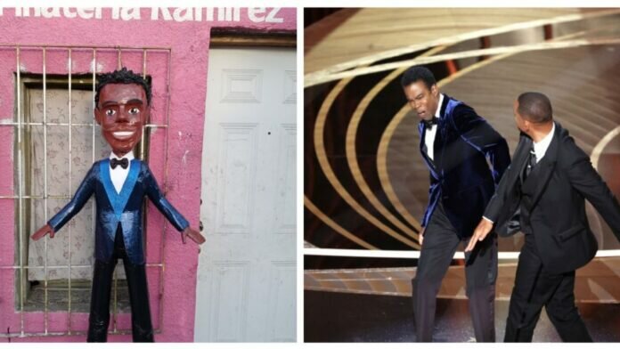 Pero las cosas no se quedaron ahí y las consecuencias por ese acontecimiento siguen dándose. Ahora, en Fecbook se hizo viral la historia de una tienda de piñatas que ya tiene a los personajes que se hicieron noticia el domingo pasado. Hablamos de Will Smith, Chris Rock y Jada Pinkett. Con la misma vestimenta con la que estuvieron en la entrega se les puede ver en el modelo de la piñata.