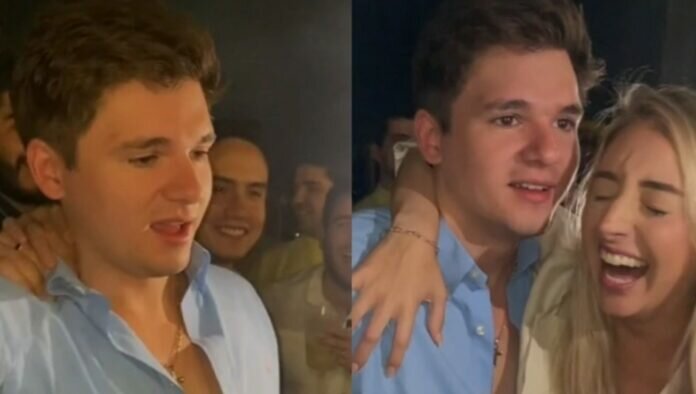 Rodeado por sus amigos, que gritan emocionados sobre su futura paternidad, el joven también descubre que la vela de su pastel expide humo azul como cuando se revela el género de los bebés.
