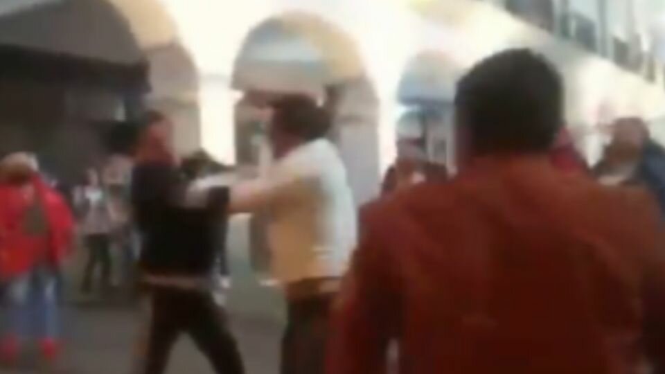 En las imágenes se aprecia como dos integrantes de diferentes agrupaciones se agreden mutuamente mientras todo un grupo de gente los rodea.