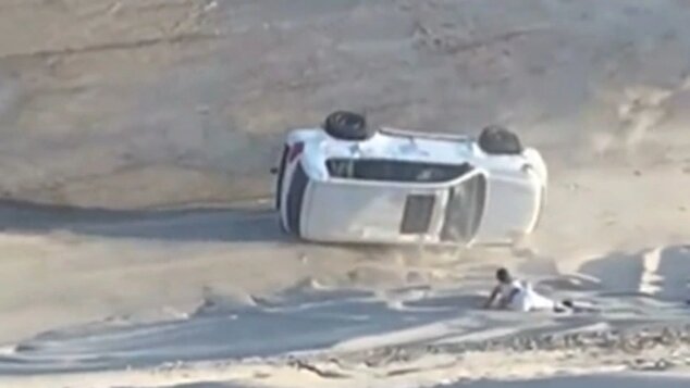 La camioneta rodó varios metros en el desierto de Qatar; se puede ver como uno de los mexicanos sale por una de las ventanas; afortunadamente se observa que puede moverse con relativa soltura.