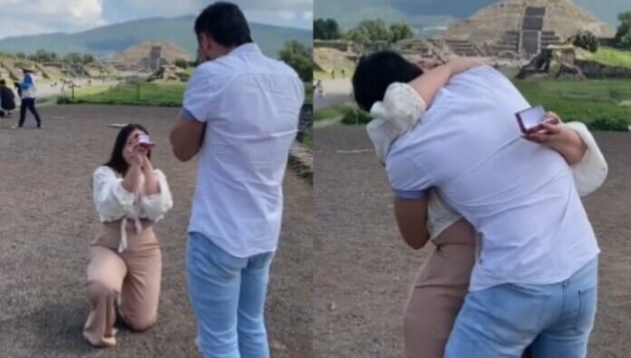 En TikTok, se ha hecho viral el video de una mujer que le pide matrimonio a su novio en Teotihuacán. teniendo una respuesta romántica de su pareja.