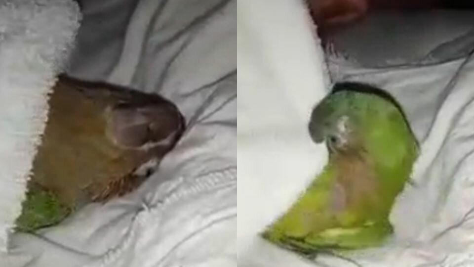 En las imágenes se aprecia como la pequeña ave se encuentra durmiendo con la cobija encima. Tiempo después, sus dueños lo tratan de destapar y el perico se despierta molesto y agarra la mantita con su pico.