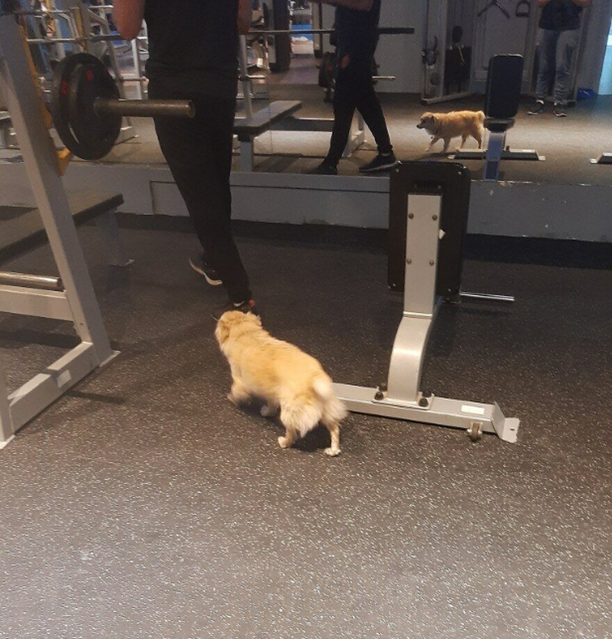 La publicación está ilustrada con la fotografía del perrito, que luce muy cerca de su dueño mientras él está en el gimnasio.