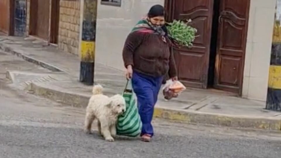 En la grabación se muestra que la mujer lleva varias cosas cargando en sus dos manos por lo que el can le ayuda con su hocico a sostener una haza de la bolsa, mientras que su dueña carga la otra para hacer más liviano el peso.