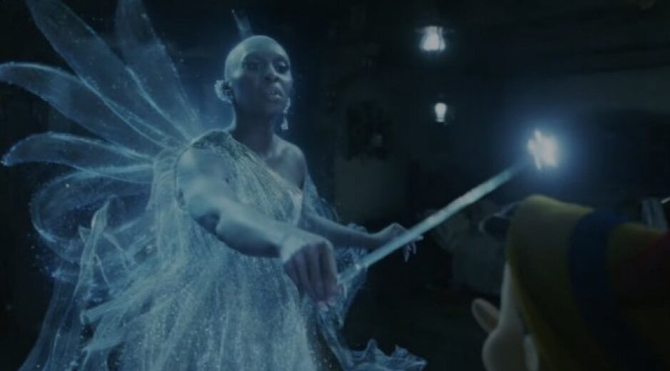 Y es que en escena aparece la “Hada Azul” que, en la película original, de 1940, era representada por una persona hermosa, de cabello rubio, tez blanca, vestida de azul y con alas brillantes, igual que su varita mágica, pero ahora es una mujer de raza negra.