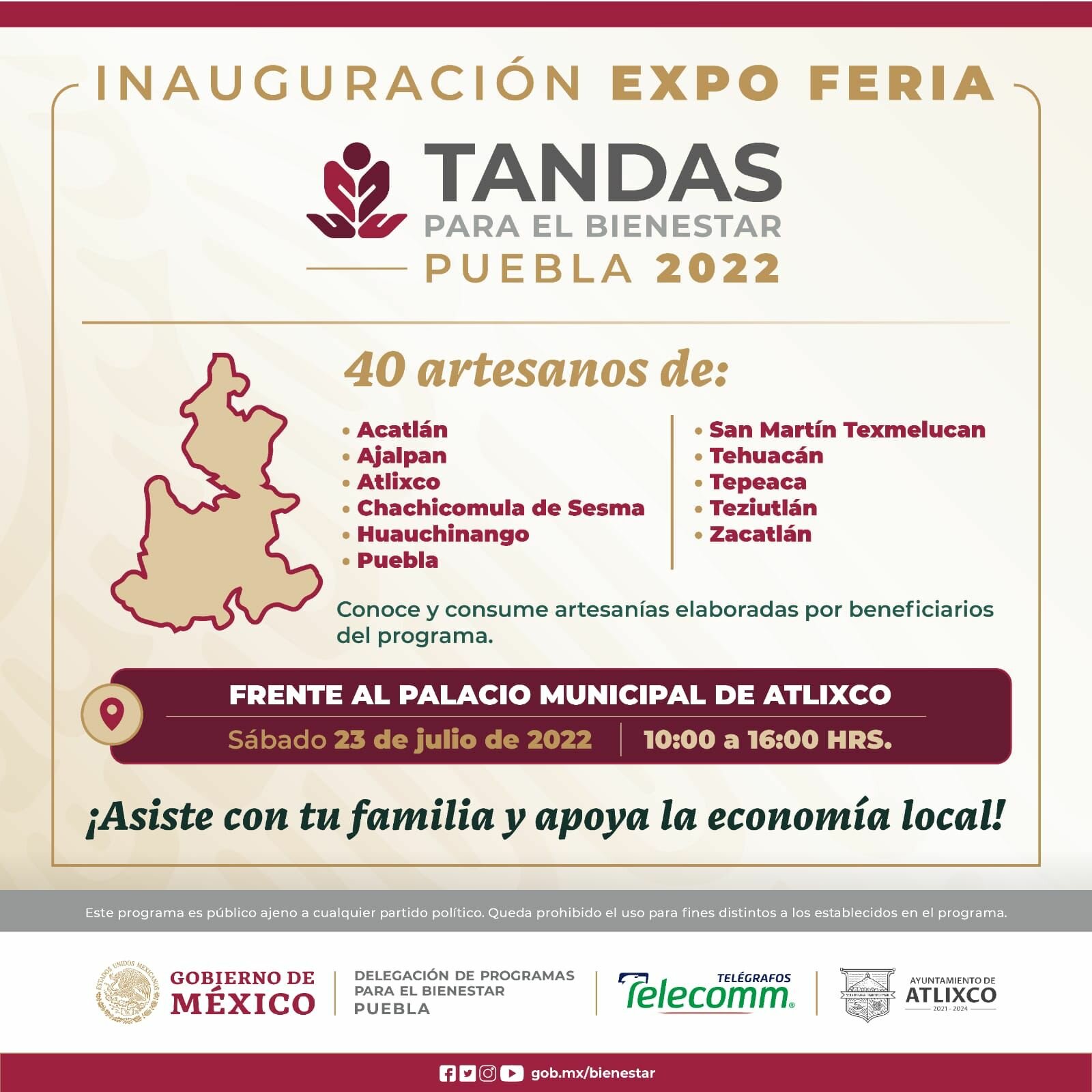 Con el objetivo de contribuir a la reactivación económica y fomentar el consumo de productos locales, la Delegación de Programas para el Bienestar Puebla y el Honorable Ayuntamiento de Atlixco 2021-2024 anuncian la realización de la primera “Expo Feria Tandas para el Bienestar Puebla 2022”.
