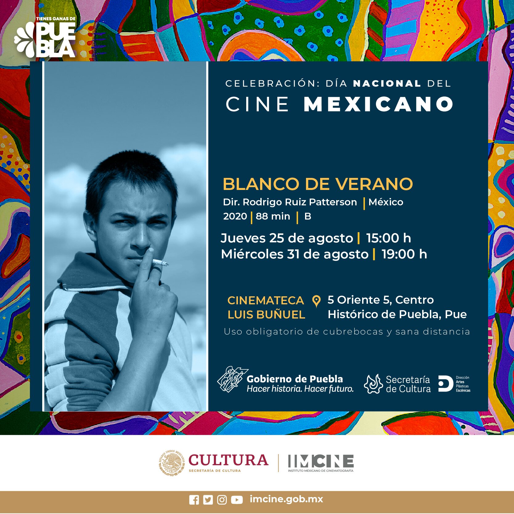 La sede de las proyecciones está ubicada en la Casa de la Cultura “Profesor Pedro Ángel Palou Pérez” (5 Oriente número 5, Centro Histórico). Las y los visitantes podrán disfrutar de las proyecciones con entrada libre y consultar más información en las páginas de Facebook “Secretaría de Cultura Puebla” y “Cinemateca Luis Buñuel”.