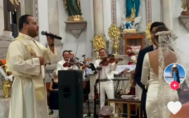 En la video grabación se le puede ver al clérigo cantando, con mucha pasión acompañado con música de un mariachi que también se encuentran en la iglesia, la pareja de novios se muestra emocionada por la melodía que les dedican.
