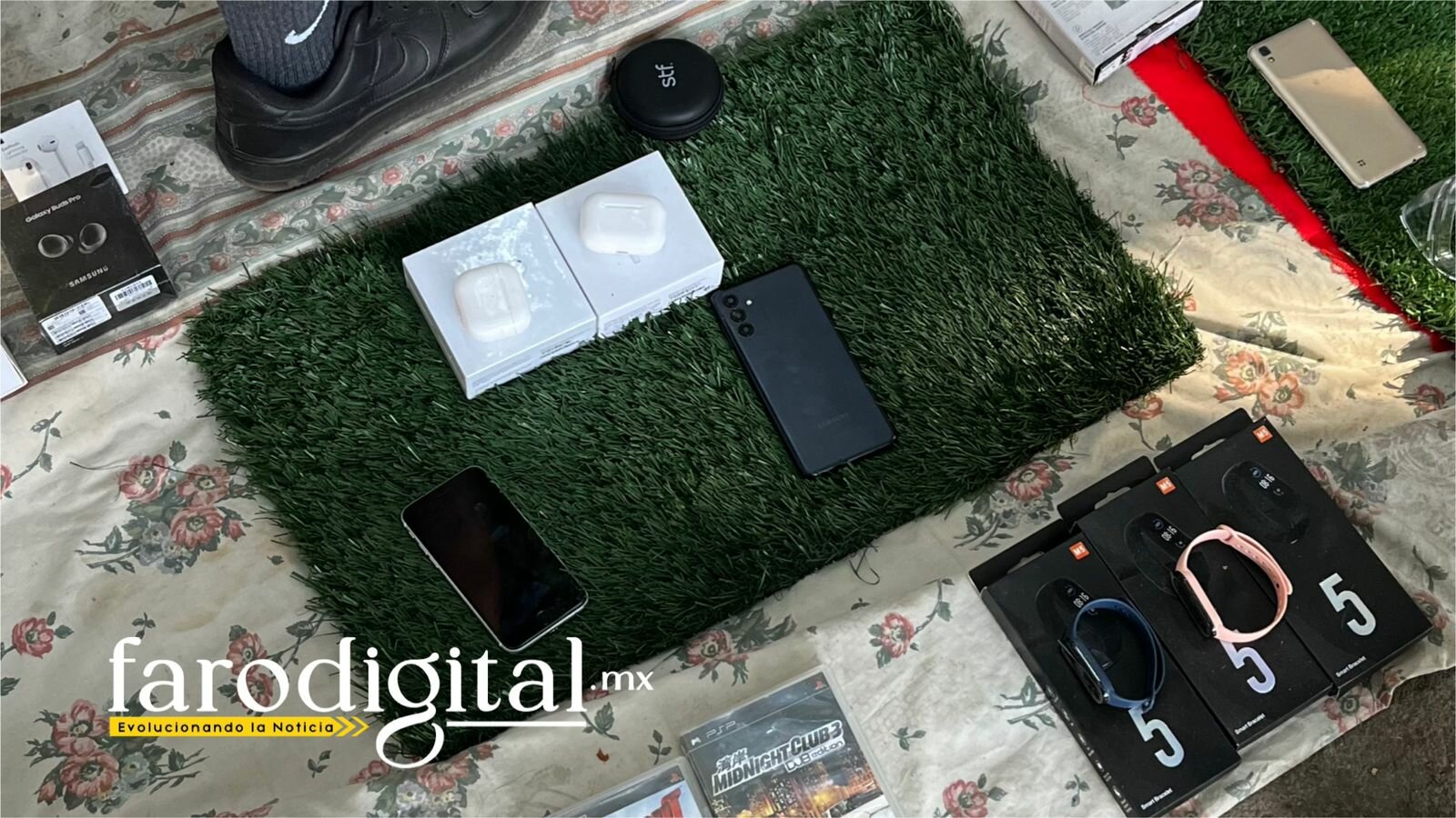 Asimismo, se pudo ver qué un puesto comercializa productos de la marca Apple como un iPhone 7 cuyo costo es de tres mil 500 pesos y un iPhone SE que dan en cuatro mil 500 pesos; así también cuentan con Airpods de dos mil 500 pesos, todos de dudosa procedencia.