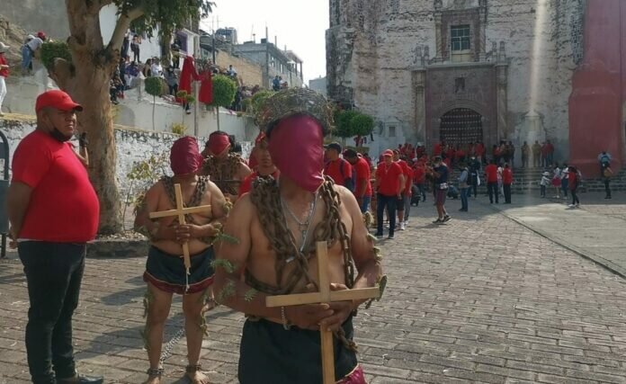 Sin importar el sol a plomo de esta época del año, los engrillados caminan semi desnudos y por las calles de este pueblo mágico, donde también se les pueden observar pequeñas cruces en sus manos, además de que siempre van cubiertos del rostro.