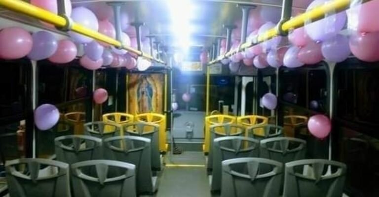 El hombre decoró el autobús de la Ruta Sur Dalias con globos blancos, rosas y morados con motivo del Día Internacional de la Mujer asimismo, colocó una frase al final de la unidad en donde se puede leer “Feliz Día de la Mujer” con letras color blanco y morado.