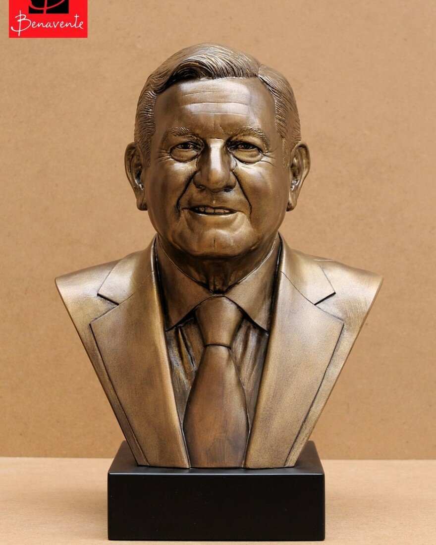 Un escultor de San Luis Potosí vende el busto del presidente Andrés Manuel López Obrador (AMLO) en acabados de bronce y lo promociona por Facebook.