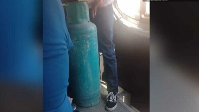 En la imagen que fue grabada por otro pasajero, se ve durante unos pocos segundos al dueño del tanque de gas de pie, dentro de la unidad, y sosteniendo su carga peligrosa.