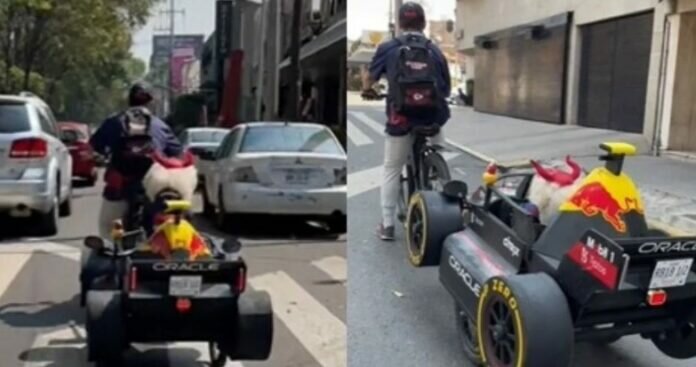 En el clip se muestra a un hombre que lleva a su mascota en una especie de carrito forrado del auto del piloto de Fórmula 1 mexicano, mientras que una persona graba un lapso del recorrido de este par de campeones.