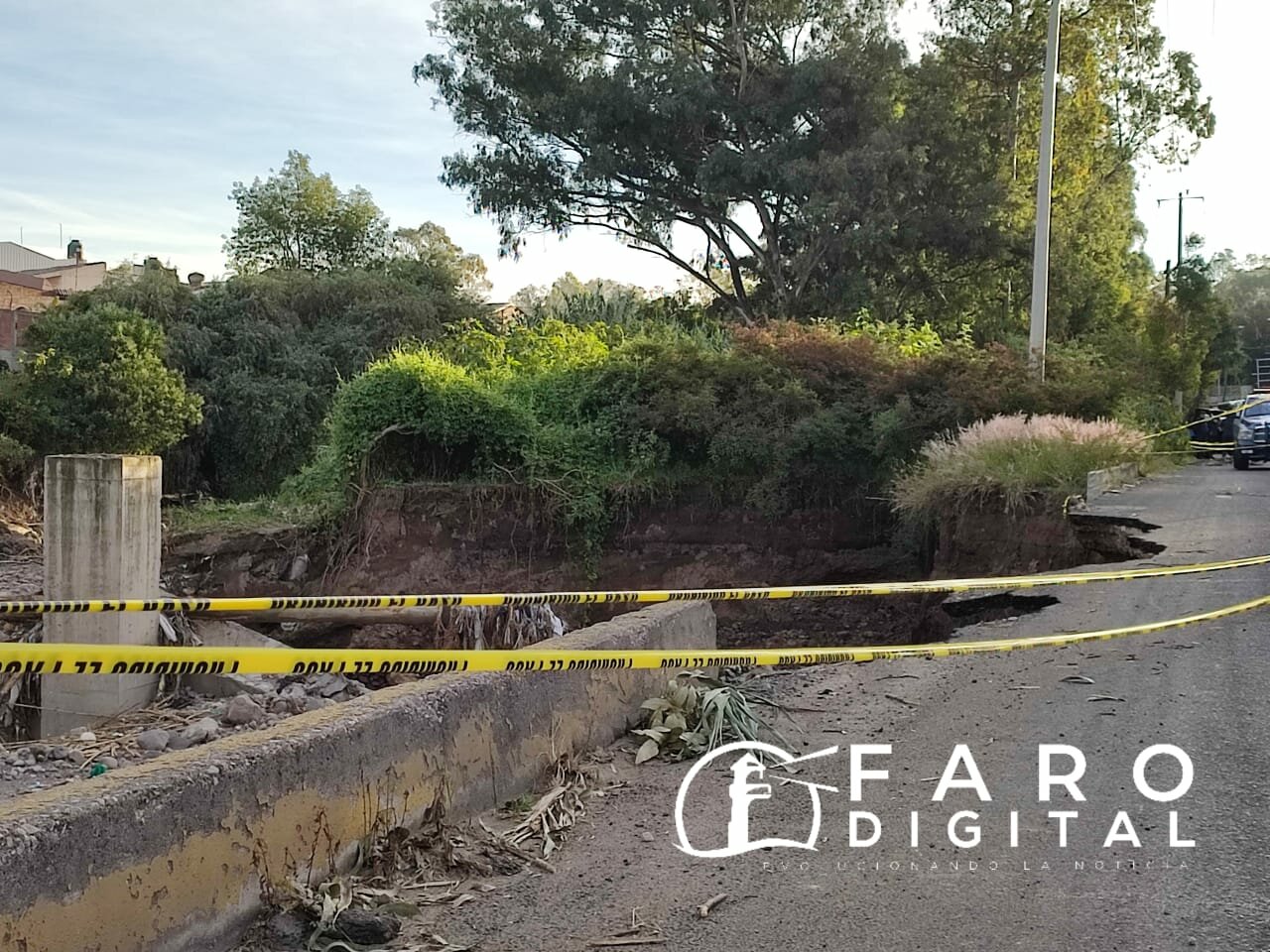 Con base en las imágenes, el desprendimiento de la vialidad abarca parte del carril de baja, incluso, es evidente una cuarteadura que podría provocar un desprendimiento más amplio de esta vialidad.