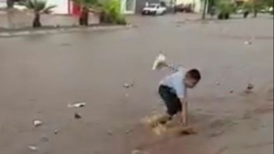 Los hechos ocurrieron en Guaymas, Sonora, estado que ha sido afectado por fuertes precipitaciones. En la grabación se observa a un menor persiguiendo sus chanclas, las cuales están siendo arrastradas por una intensa corriente de agua.