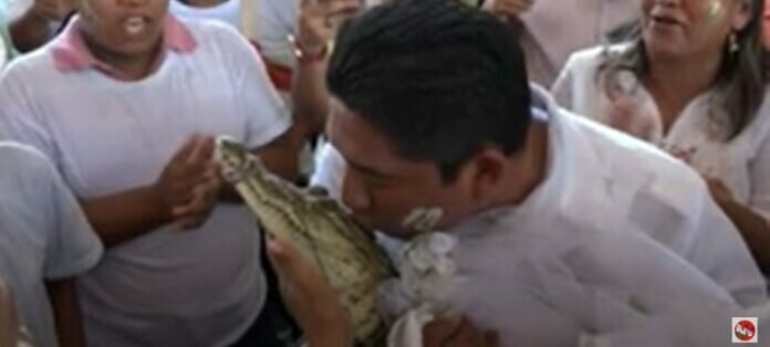 El alcalde de San Pedro Huamelula, Oaxaca, Víctor Hugo Sosa, se casó durante una colorida ceremonia con un caimán para lograr atraer abundancia.