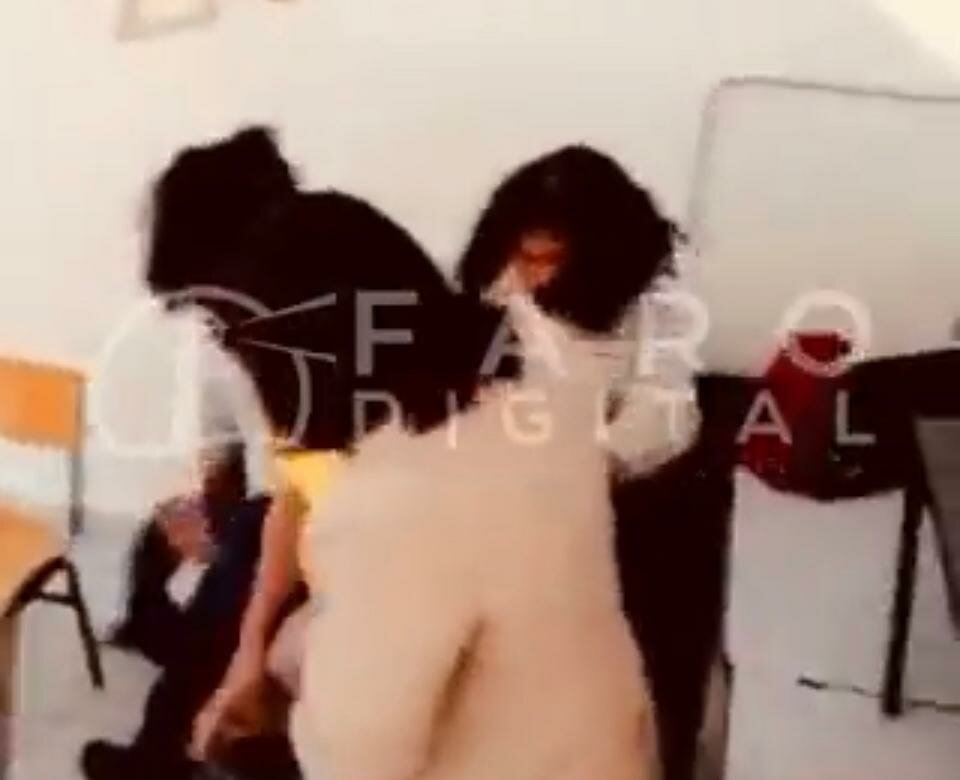 En las imágenes se aprecia como las maestras de nombre Lina “N”, y Laura “N”, agreden a su compañera, en un salón de clases, perteneciente a esta institución educativa, por presuntos temas “pasionales”.