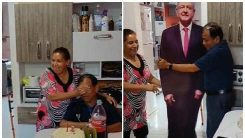 Un hombre que estaba festejando su cumpleaños, recibió como obsequio una gran figura de cartón del presidente de la república, Andrés Manuel López Obrador, y la reacción que tuvo dejó a la mayoría con la boca abierta.