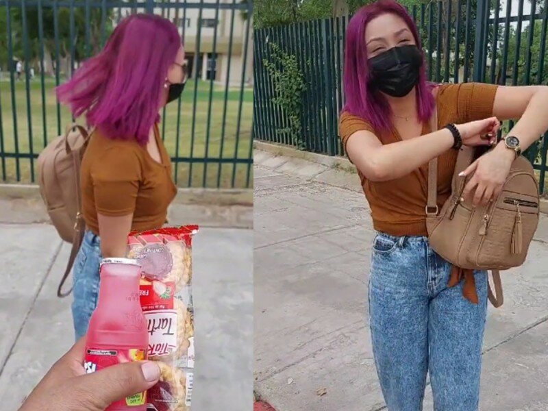 Así, le indica: “Se te olvidó tu lonche, mija, toma, que Dios te cuide y te bendiga”, tras ello le ofrece unas galletas y un jugo Frutsi, lo cual provocó que la joven comenzara a reírse para luego preguntarle si lo subiría a TikTok.