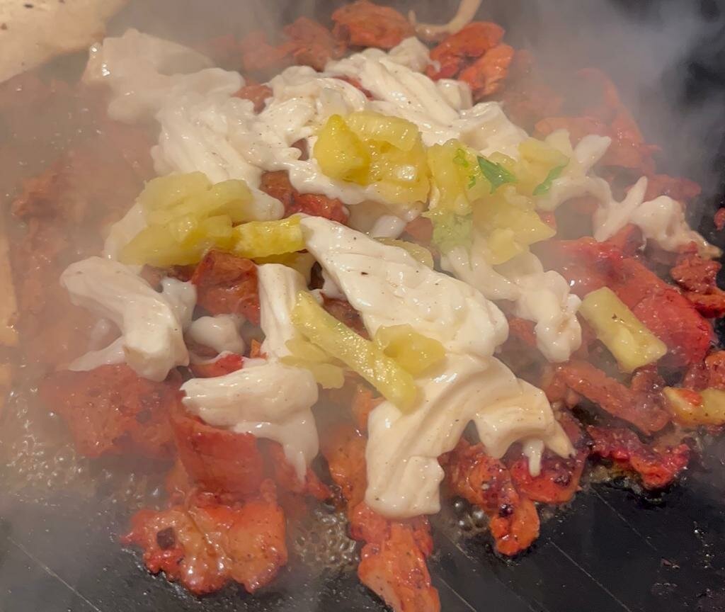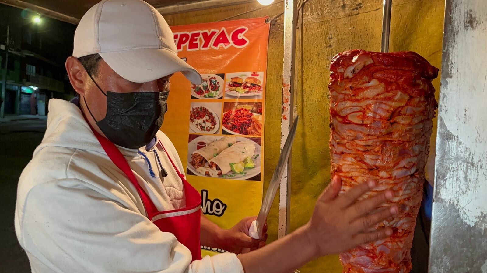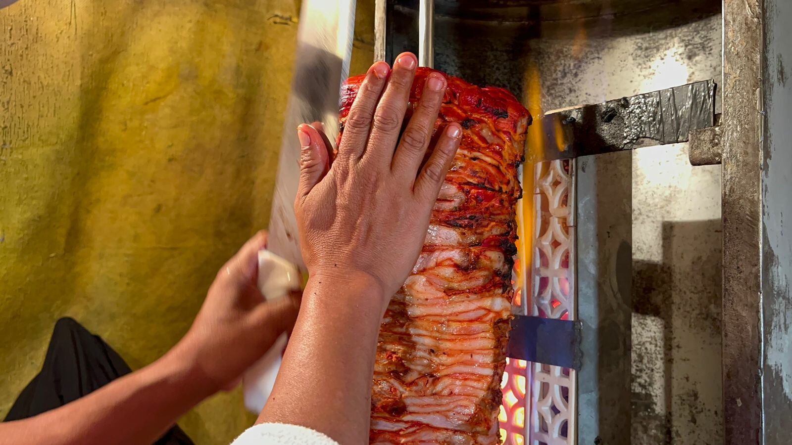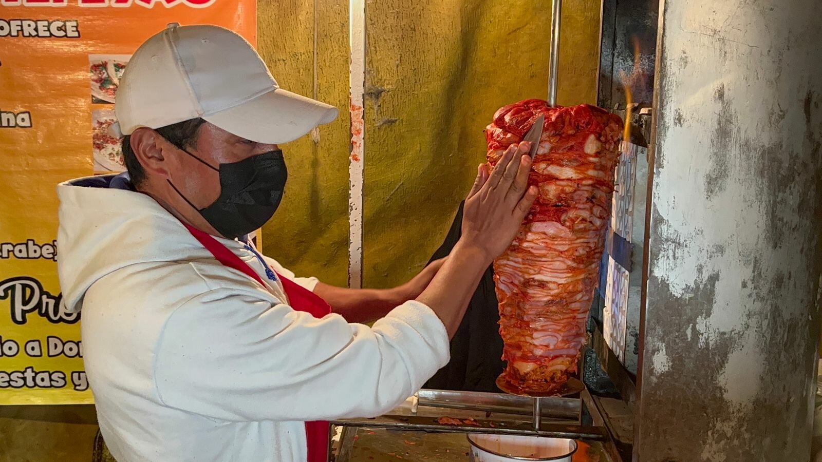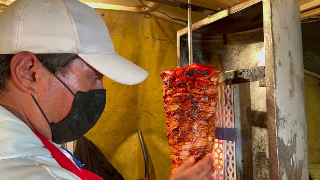 El caliente trompo de la rojiza carne gira al lado de las llamas ardientes y las manos de Don Juan Carlos Sánchez, oriundo de San Nicolás Buenos Aires, cuna de los mejores taqueros de Puebla, palpan la textura para saber el punto exacto de su cocimiento.