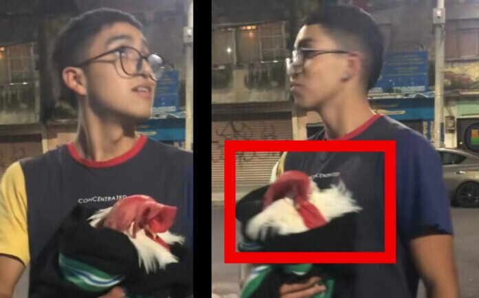 Una vez pasado el susto, el TikToker compartió el video en esta red social sin temor a ser juzgado por haber salido a la calle con su gallo blanco envuelto en una cobija. En el clip se escuchó a una voz femenina decirle: